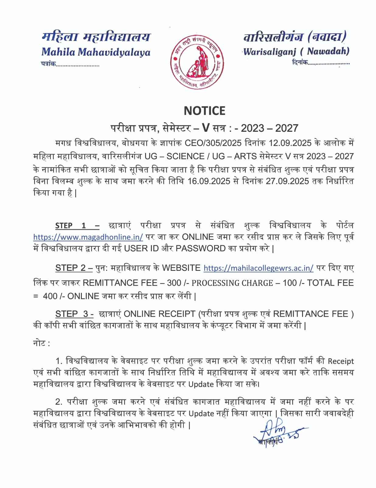NOTICE REGARDING UG 5TH SEMESTER EXAM FORM (2023-27)