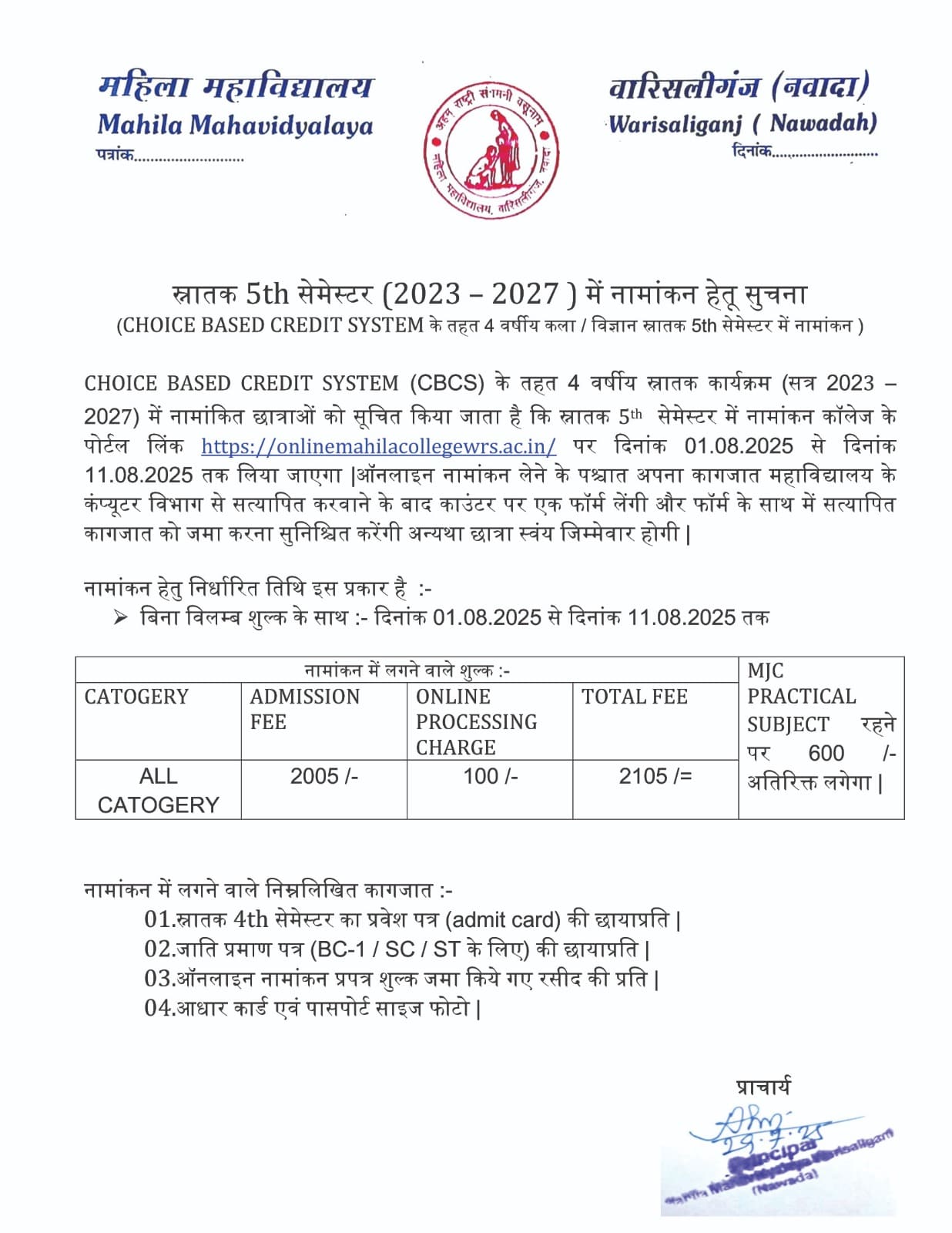NOTICE REGARDING DEGREE 5TH SEMESTER (2023-27) ADMISSION